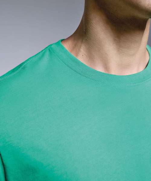 Solid colours are 100% organic cotton. Marl colours 60% cotton and 40% polyester. 32's cotton count. Retail fashion fit. Soft-feel finish. Ribbed crew neck. Chain stitch detailing on shoulders and around back of neck. Twin-needle stitched on hem and cuffs. Self-coloured neck size label.