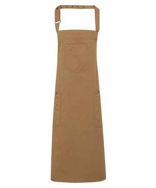 This full bib apron is designed with classic 'chino' style accents for a cool and edgy uniform solution for bars and restaurants. There are three functional pockets for design and practicality, together with a simply pop-snap button fastener to secure the neckband in place.