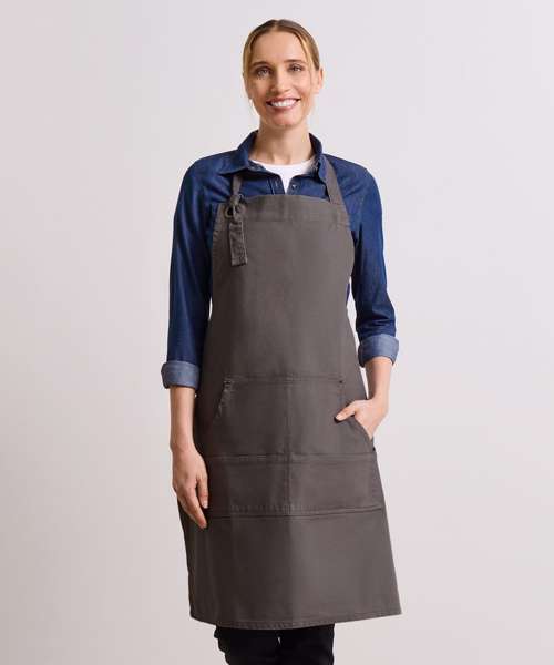 A welcome addition to the existing range of Calibre aprons, this full bib style sees a kangaroo style pocket stitched into four handy compartments. Finished with rivets for styling and a gun metal eyelet for facilitating the neckband, this apron offers a touch of luxury with the heavy cotton canvas fabric giving a soft, yet tough feel.