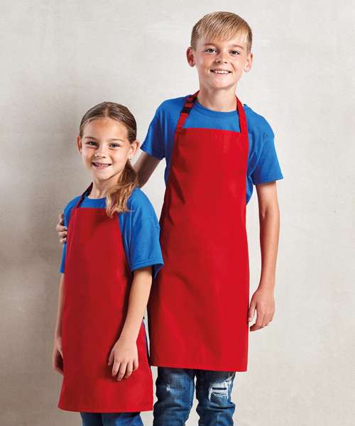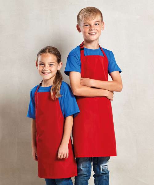 Waterproof bib apron. Self-fabric neckband and ties. Adjuster and safety release mechanism on the neckband. Infant and Junior sizes.