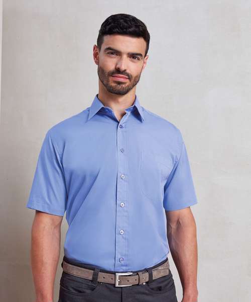 A short sleeved Poplin work shirt for men available in 30 colours from Premier's 'Colours Collection.' This classic fitting shirt has a stiffened formal cut collar that can accommodate a tie and the main body has a useful left breast pocket.