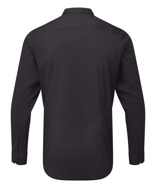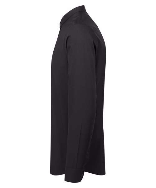Long sleeve unisex shirt. Double button cuff and sleeve guard. Typical banded grandad collar with top button fastening. Easycare fabric.
