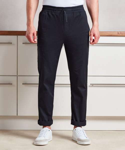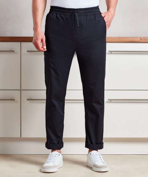 For a modern look in the kitchen, pull on these lightweight cargo trousers. Made with certified recycled polyester, the classic cargo design means these trousers boast multiple pockets with an elasticated drawcord waistband for complete comfort throughout your shift. They have a tapered fit to the lower leg with optional turn-up hem for a relaxed, on-trend look.