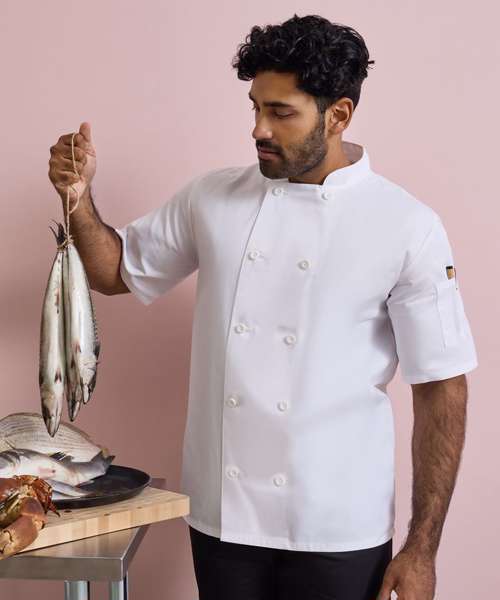 A very popular style seen in commercial kitchens, this short sleeve chef's jacket features a ten button wrap over fastening. To withstand the demands of repeated washing, the buttons are long life resin buttons. A very smart jacket for chef with a mandarin collar for a streamlined look. The left sleeve features a useful pen pocket.