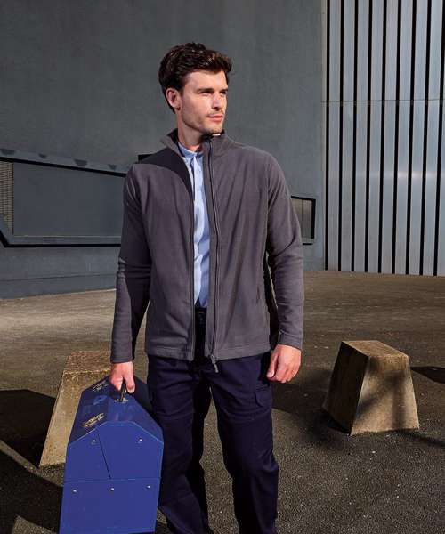 Men’s full-zip microfleece. Anti-pill fabric prevents bobbling. Self-coloured zip pull. Chin guard and storm flap. Cadet collar. Side panels. Side-seamed open pockets. Straight finished hem. Made from 100% certified recycled polyester.