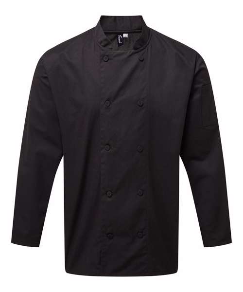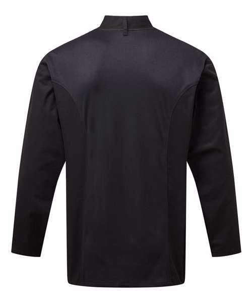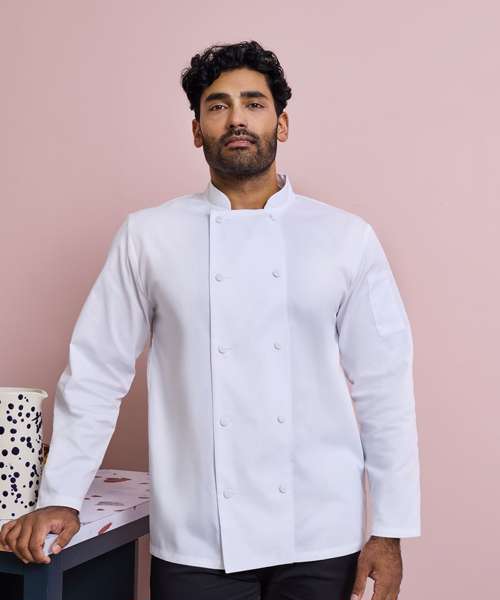A long sleeve chef's jacket constructed with Coolchecker® fabric. The centre back panel is made from the Coolchecker® fabric which offers exceptional moisture management and wicking properties so chef stays fresh and cool during service. A wrap over fastening with ten self-fabric buttons, a mandarin collar and a useful double pen pocket on the left arm.