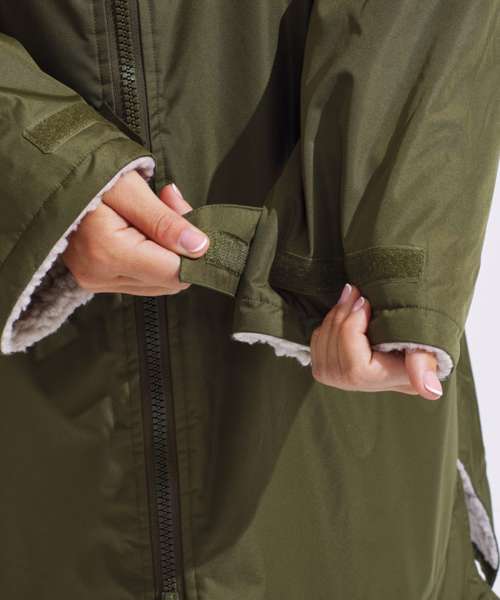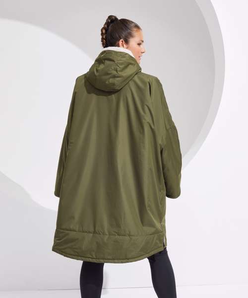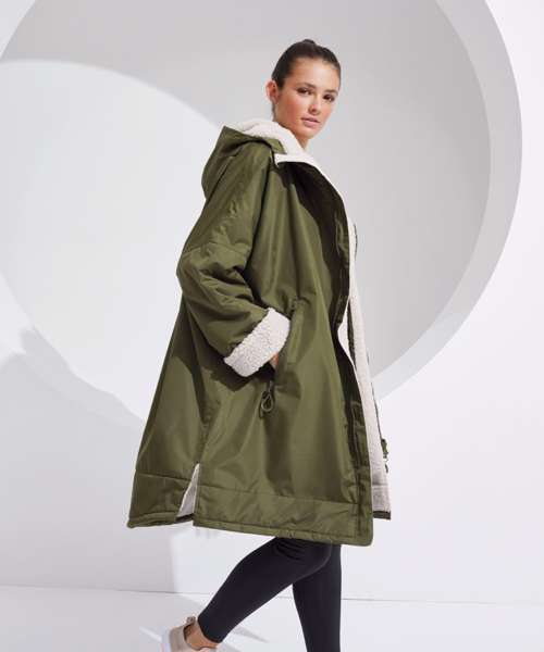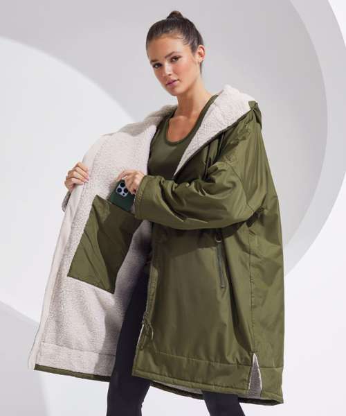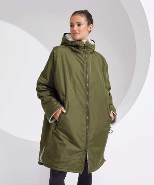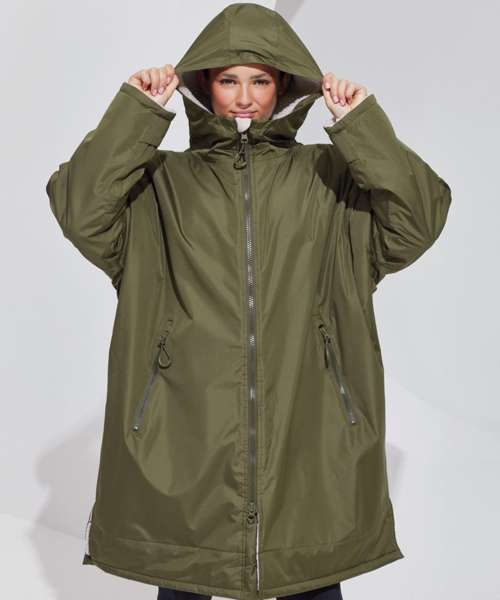 Unisex. Oversized. Full-length two-way plastic zip with easy pull toggles. Chin guard. Oversized fit. Side vents. Adjustable cuffs with hook and loop fastening. Side zip pockets. Inside pocket with zip on the left side. Inside patch pocket on the right side. 3-panelled hood. Loop on the centre back of the jacket for hanging the robe. Dropped back hemline. (5000/5000 waterproof and windproof). Embroidery access to the back and chest area can be accessed through here. Waterproof taped seamed outer layer. Sherpa fleece interior. Rebrandable stuff sack carry bag with double drawstring straps. CE Class 1 Certified.